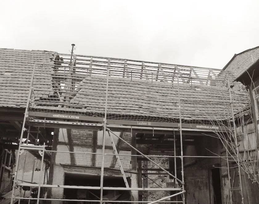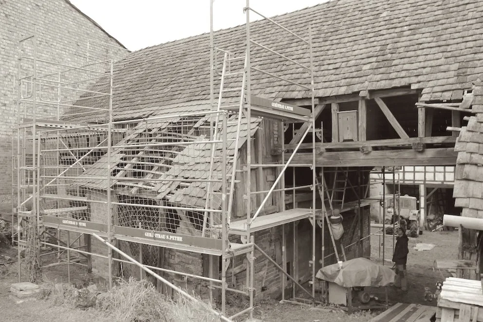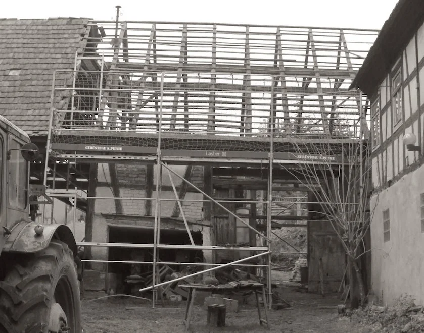 Es ist soweit: Zum ersten Mal seit drei Jahren Entrümpelung wird das alte Gebäude nun tatsächlich bautechnisch angerührt. Innerhalb eines Tages haben die drei Gerüstbauer die halbe Scheune in ein neues Gewand gehüllt.