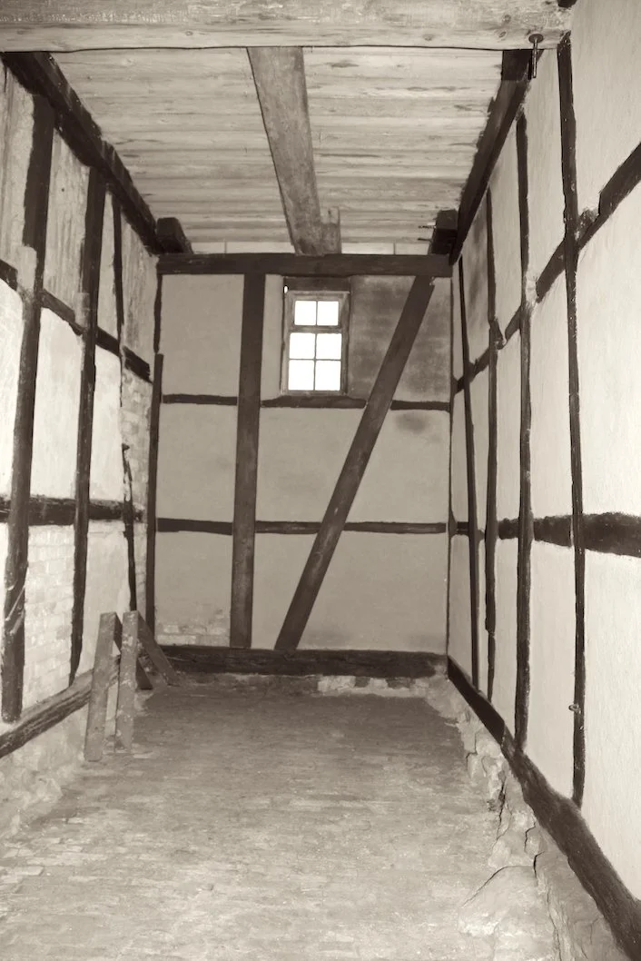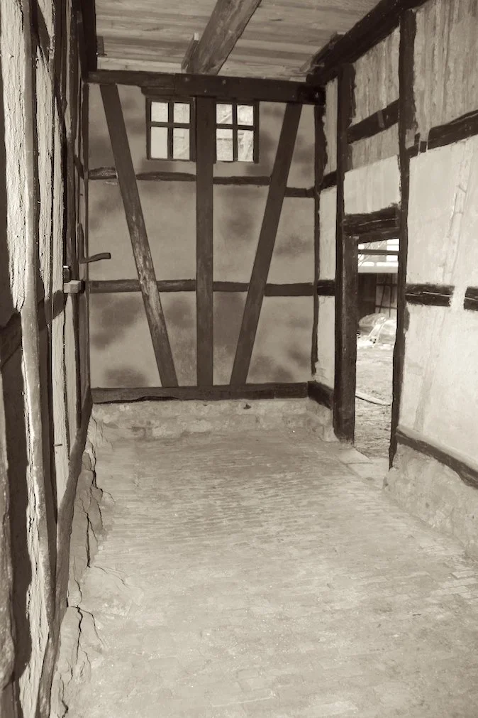 Über die Zeit räumten wir auch diesen Raum aus und erneuerten sowohl Balken als auch Gefache. Für die Gefache nutzten wir die vorhandenen Ziegel, die wir zuvor von alten Mörtel- und Lehmspuren befreit hatten. Die Fenster wurden von unserem Maurer Rainer handgefertigt, versiegelt und neu eingepasst.