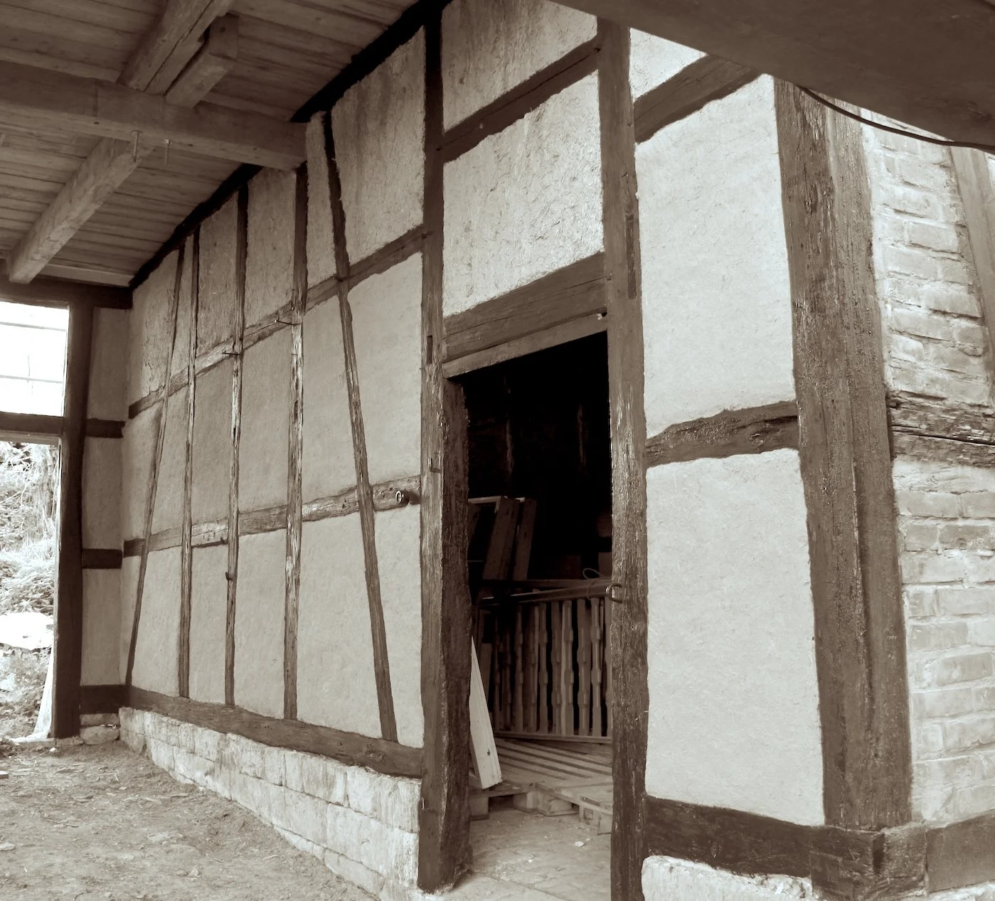 Freigelegter Holzschuppen mit neuwertigen Balken und Gefachen