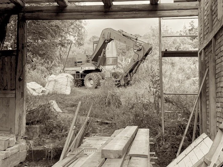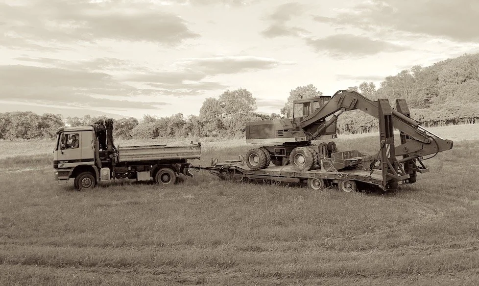 Die alten Traktoren haben den Hof verlassen und nun gibt eine neue Landmaschine auf dem Hof: einen Liebherr-911-Bagger. Der Vorbesitzer fuhr ihn mit Hilfe seines Transportfahrzeugs ganz spektakulär über das Feld von der hinteren Gartenzufahrt auf unser Grundstück. Bislang schmückt der Bagger unseren Garten und wir üben den Umgang mit diesem Kraftgerät. Wir wollen ihn unter anderem zur Begradigung von einigen Gartenflächen und zur Unterstützung bei diversen Hofarbeiten verwenden.