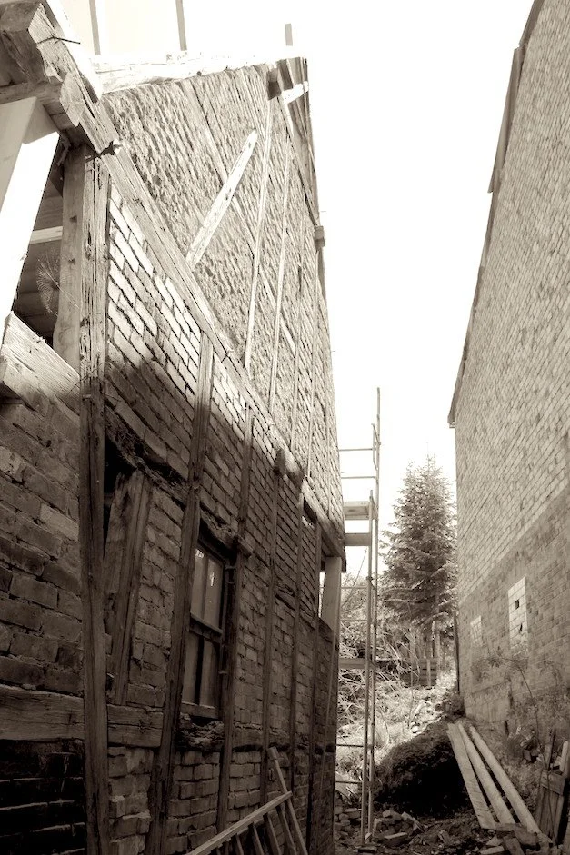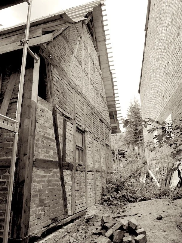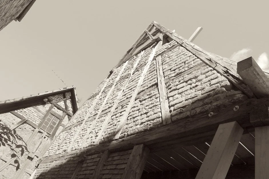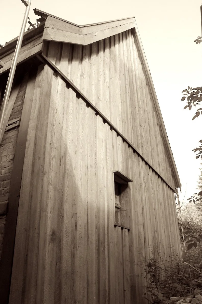 Nachdem im zukünftigen Holzlager im Westteil der Scheune die morschen Balken fachkundig ausgetauscht und die Gefache durch Matthias erneuert worden waren, ging es mit der Fertigstellung des Dachstuhls weiter. Danach verschalten unsere Handwerker die Giebelwand, die giebelseitige Fassade bzw. Stirnseite im Westen. Der Außeneindruck kann sich nach etwa anderthalb Jahren Bauzeit wahrlich sehen lassen!