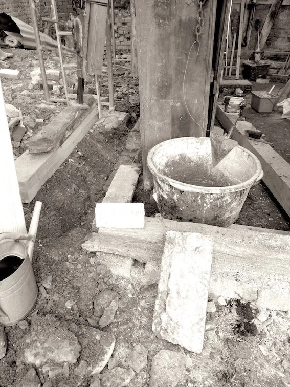 Morscher Balken an der Schwelle (links vom Eimer); herausgeschnittener Balken links daneben sichtbar