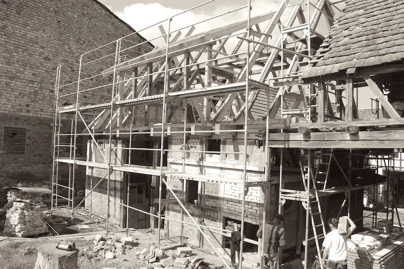 In alten Fachwerkhäusern sind substanzielle Schäden im Gebälk verbreitet. Im ersten Bauabschnitt ertüchtigen und reparieren unsere Handwerksmänner den westseitigen Scheunenteil.